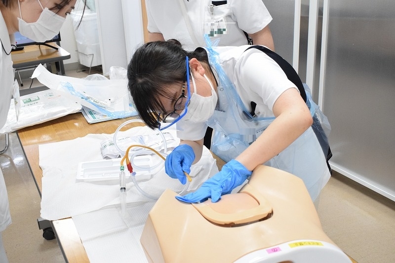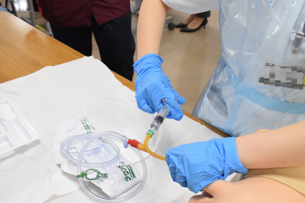 実際の物品と模型を使って、実際に挿入・留置を行いました。